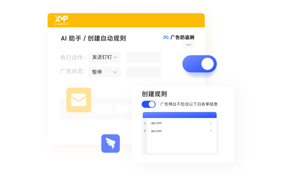 投放网址白名单:优化师可设定一个白名单,列出所有允许的广告投放网址。XMP的「防盗刷」功能将监控所有广告的投放链接,一旦发现非白名单内的网址,系统将自动暂停广告。